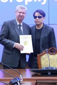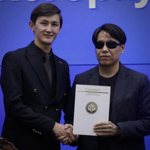 Б.Бейшеналиева атындагы КММИУнун искусство факультетинин окутуучусу Виктор Жихарев менен студенти Тилекмат Касияров Жогорку Кеңештин депутаты Дастан Бекешовдон ыраазычылык баракчаларын алышты.