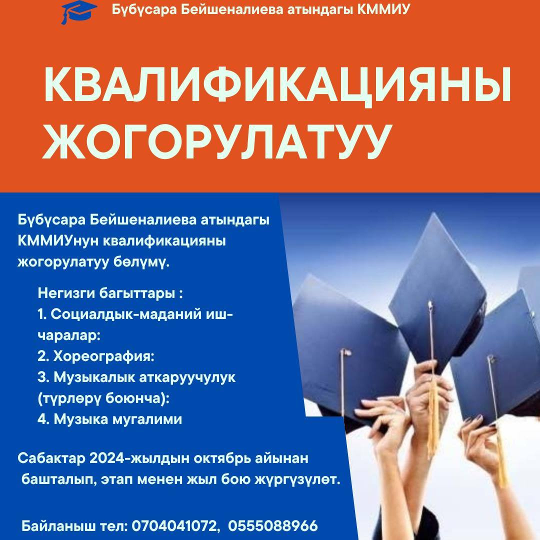 Бүбүсара Бейшеналиева атындагы КММИУнун квалификацияны жогорулатуу бөлүмү кесиптик көндүмдөрүн жана педагогикалык билимдерин өркүндөтүүнү каалаган окутууларды квалификацияны жогорулатуу боюнча КР Билим берүү жана илим министрлиги тарабынан берилген Лицензия №LE170000243 жана Лицензия №2023-0073 1-тиркемесинин негизинде кошумча билим берүү программалары боюнча окуу курстарын жарыялайт.