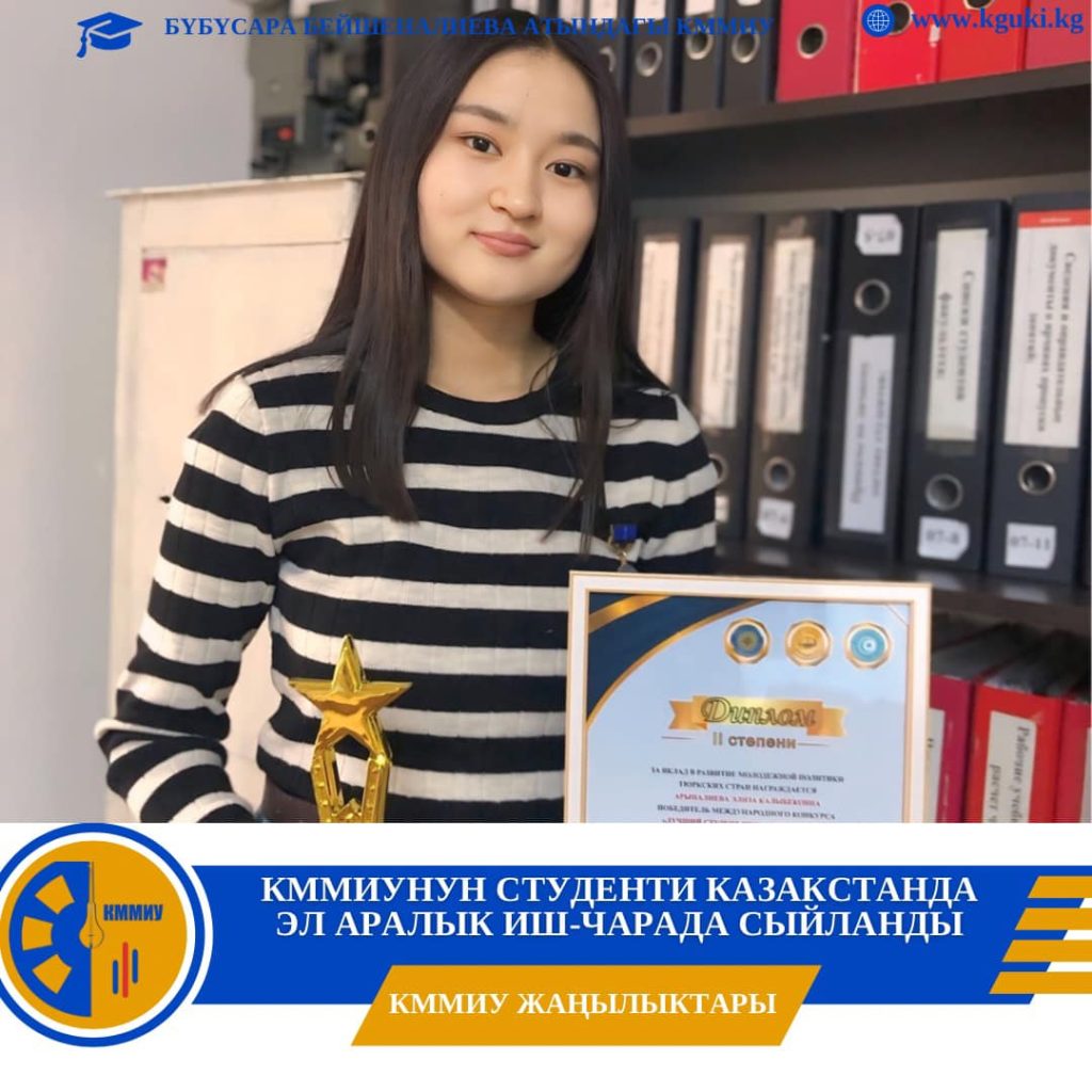 Түрк элдеринин мыкты студенти Оставьте комментарий / От admin / 11 ноября, 2024 КММИУнун кино жана теле берүү факультетинин студенти Элиза Арыналиева Казакстанда өткөн иш-чарада “Түрк элдеринин мыкты студенти” наамына ээ болду. Б.Бейшеналиева атындагы КММИУ Маданият Жана Искусство Университети